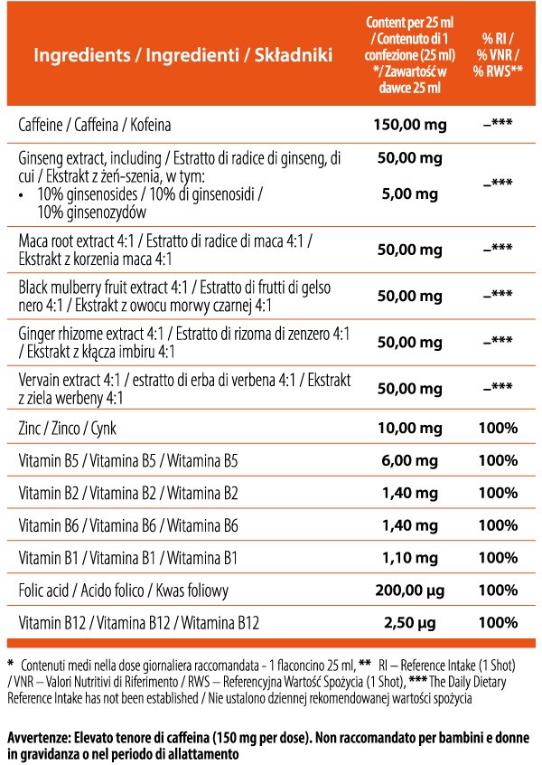 Složení: Čištěná voda, regulátor kyselosti (kyselina citronová), kofein, aroma, ženšenový extrakt (Panax ginseng) standardně v poměru 10 % ginsenosidů, extrakt z kořene maca (Lepidium meyenii) 4:1, extrakt z plodů moruše černé (Morus nigra) 4:1, extrakt z oddenku zázvoru (Zingiber officinale) 4:1, extrakt z byliny verbeny lékařské (Verbena officinalis) 4:1, hořčík (glycinát hořečnatý),
